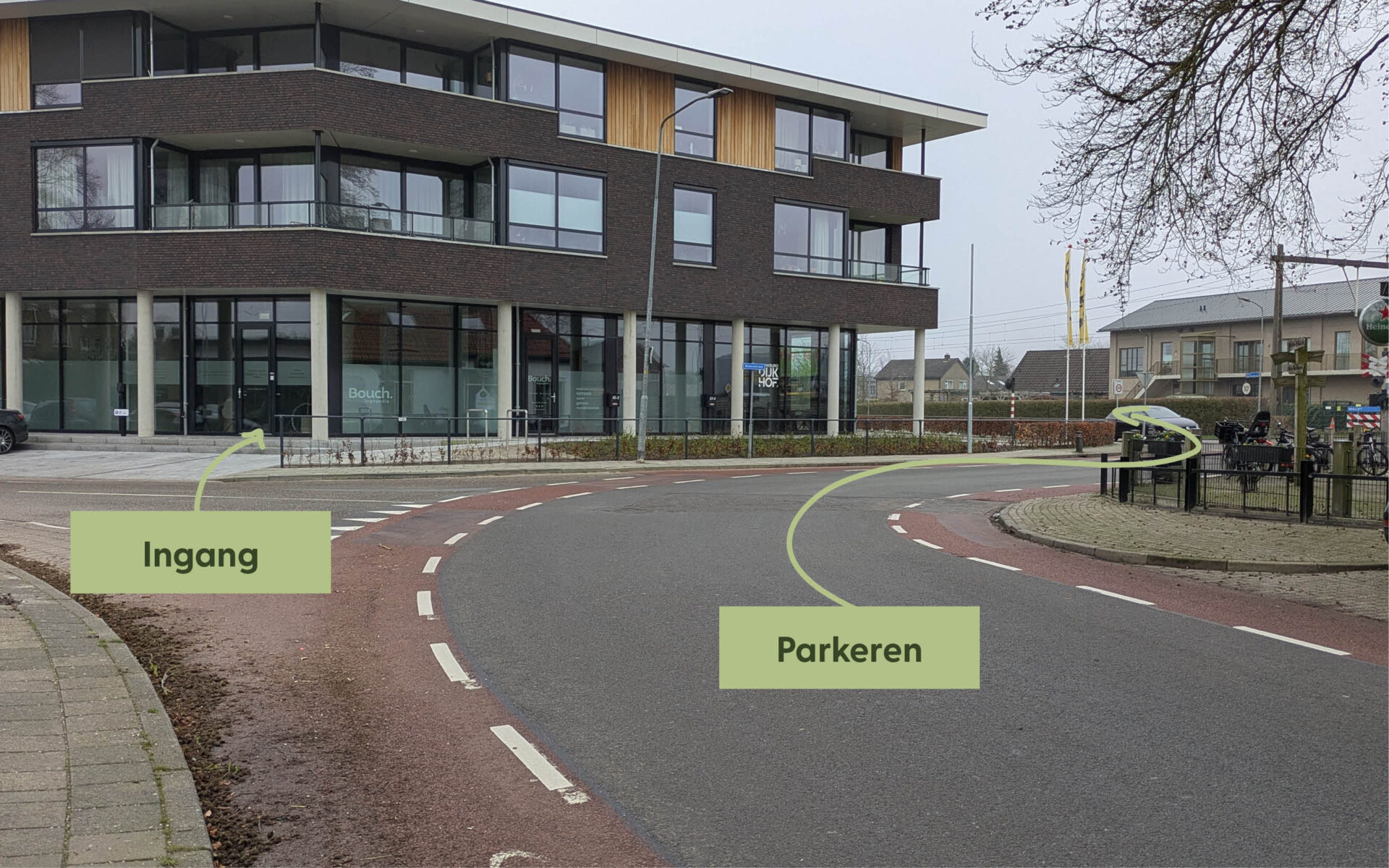 > Parkeren met de fiets kan in de fietsenstalling naast de ingang van de praktijk